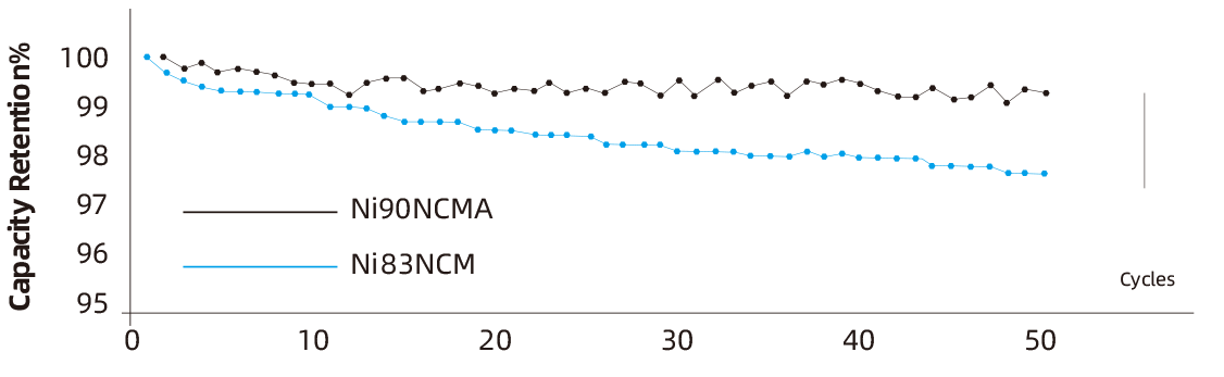 NCMA cathode material of SVOLT can withstand 20℃ higher than NCM811 material in terms of DSC thermal stability, and can reach 50 cycles without capacity fading (99.5%)